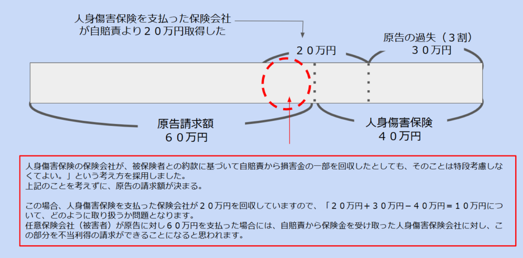 つまり、「人身傷害保険の保険会社が、被保険者との約款に基づいて自賠責から損害金の一部を回収したとしても、そのことは特段考慮しなくてよい。」という考え方を採用しました。