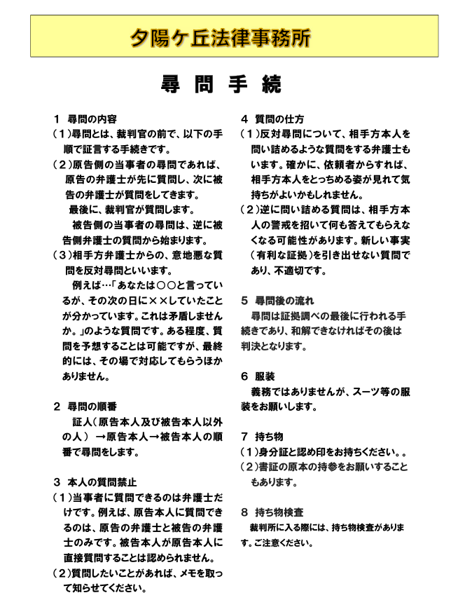 | 尋問手続の案内 1 次回期日 時間 令和7年 月 日 午後1時30~午後5時 (予定ですので、30分程度延びる可能性がございます。) 集合場所 大阪地方裁判所 本館 号法廷 大阪地方裁判所 所在地 〒530-8522 大阪府大阪市北区西天満2丁目1−10 電話 06-6363-1281 持ち物 印鑑(認印) 免許等の身分証明書をお持ちください。 2 服装 義務ではありませんが、スーツ等の服装をお願いします。 3 尋問の内容 (1)尋問とは、裁判官の前で、以下の手順で証言する手続きです。 (2)私たちが、尋問メモ通りの質問をしますので、それに答えて頂きます。 裁判官は、それのやり取りを聞き取って、判断の材料にします。 (3)私たちの次に、相手方の弁護士が様々な質問をしてきます。 例えば…「あなたは○○と言っているが、その次の日に××していたことが分かっています。」 「これは矛盾しませんか。」というような質問です。 最終的には、その場で対応してもらうほかありません。 (4)最後に、裁判官が質問して終わります。 4 持ち物検査 裁判所に入る際には、持ち物検査があります。ご注意ください。 5 証拠物(※ 裁判所が証拠物の原本の持参を求める場合があります。) 〇 〇 〇 |